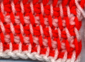 The return half of the row is equally simple. The second loop on the hook will always indicate the next color to be drawn through. As before, you will need to cross the two yarns to prevent gapping. Pull the old color to the left, across the back of the next stitch.