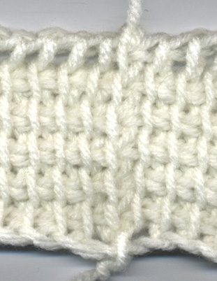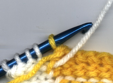 My simple method of weaving in all those little ends makes it possible to change colors in the afghan stitch without the use of knots. The ends are quite secure and the weaving is almost invisible.