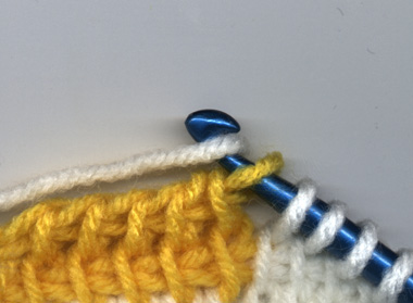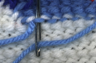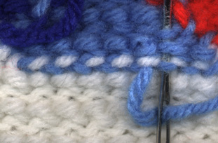 Picking up a previously used color is quite simple also. To keep the stitches from gapping apart at a color change, the old color must be secured. To do this, pull the old color across the back of the next stitch and pull the new color up over it.