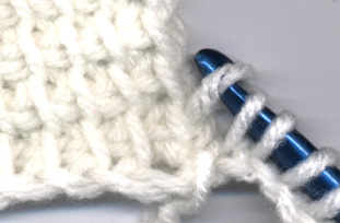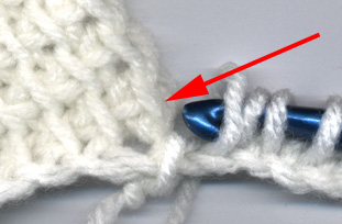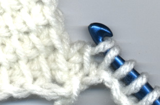 There has been much debate about what constitutes a single "afghan stitch". Some say that the LAST loop on the hook is not a stitch because you only draw through one loop to make it. Others say that EVERY loop on the hook counts as a stitch. That was what I thought as well, until I started working in panels. Because of the way panels and color changes work, I have concluded that the vertical bar and the solid space to its RIGHT are what constitute a single stitch.