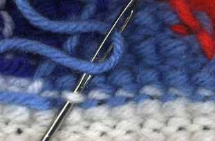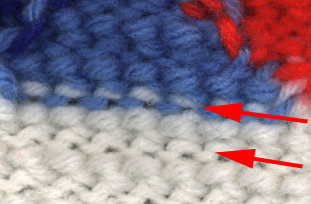 Make sure to leave a 6 to 8 inch tail whenever you start or end new yarn. I generally use a metal or plastic yarn needle. On the back of your work, you can easily see where one row loops around another. I've used an area where two colors meet so you can easily see how the two rows loop around each other. These are the loops in which you will weave.