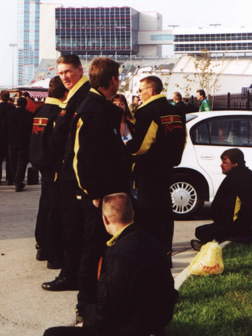 Around the corner, near the Busch Garage gate, we spotted these Winn Dixie crewmen waiting to be let in.