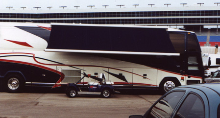 We finally wound up on the south side of the track and pulled into a paved parking area there. Loaded up with cameras and gear, we quickly walked to the South Tunnel entrance and were stopped by a security guard who had seen us park and said we couldn't park there -- it was reserved for VIPs. I thought to myself, "Of course it is reserved for VIPs, it's paved, isn't it? If it was for use by the general public, it would be dirt!" We did argue with him that all the other parking lots were locked up, but he didn't care, and just repeated several times that the regular parking lot gates would be opening at 8:00. We finally just drove around to Petty Place, got as close as we could to the paved parking area, and started walking. It really made me angry because Mom has a bad knee, and I wondered what a handicapped person would have to do, and it really made me wonder what Bruton Smith and Eddie Gossage were thinking. It certainly wasn't the comfort and enjoyment of the fans!