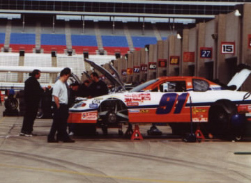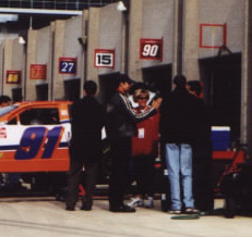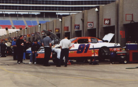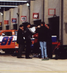 And here's a shot of the #91 crew of Todd Bodine hard at work. That's Todd himself sitting down on a stack of tires by the right front side of the car.