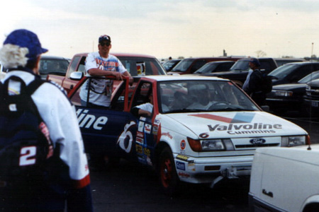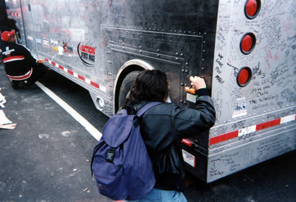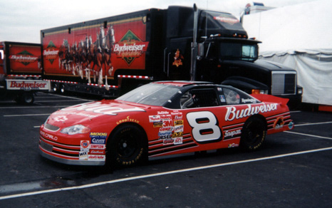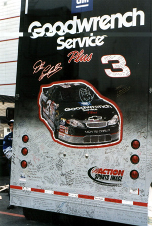 One of the highlights for me was signing Dale Earnhardt's merchandise trailer. You can't imagine what it's like to stand before those trailers and see all the writing on them. I know it looks neat on TV and in pictures, but it really is awe-inspiring to see in person. Any way, I signed my little John Hancock on the left side near the rear, kind of low (right near the back wheel and the rear lights).