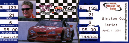We were broke when the tickets went onsale last November, and by the time we has a few extra $$$, both the track and Ticket Master claimed to be sold out (except for back stretch seats). After last year, we swore that we would never watch the race from the infield again (unless we were on top of a motorhome, of course). We have friends who've sat on the back stretch, and they had nothing good too say about it, so we knew we didn't want to sit there. That started a frantic search for seats, and we wound up buying them through a ticket agent (I think scalper would be a better word) at $160 a pop for $95 seats. On the up-side, they appeared to be in a great spot from which to watch the race. Judging by the charts, we thought we would have both a decent view straight down pit road and could see the entire track. Of course, about two weeks after we bought the tickets, the track wound up with a few more at the original $95 price tag, but we were determined not to miss the race because we waited too long and couldn't get tickets. Lesson learned: Start saving now for next year's tickets!