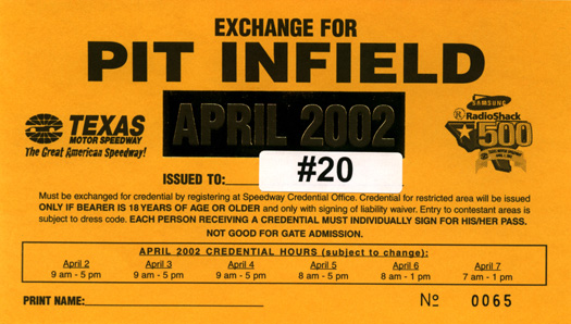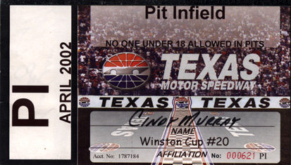 Much to my surprise, in early March 2002, one of Mark's connections came through with Pit/Garage Passes. Mark thought Mom and I would enjoy the passes more than he would, so he was off to Lubbock to visit his nephew from San Francisco while Mom and I headed to the races.