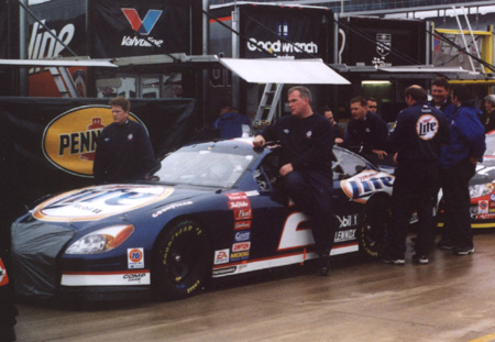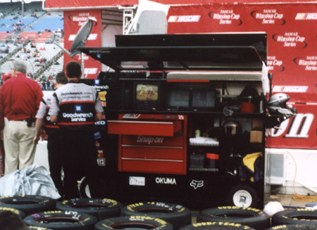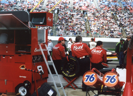 I missed most of the first pit stop because two DEI executives entered the pit and stood right in front of me, blocking my view. After it was over, I ate my burrito (Mom said she warmed hers up by laying it (in foil) on the side of one of Rusty's used tires. She also notes that when the tires came off the car, the sidewalls were hot, but the side that touches the track (what do you call it if it doesn't have tread?) was relatively cool.
